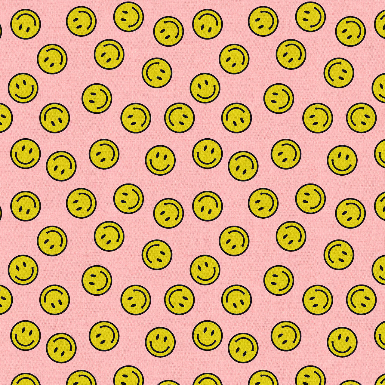 Pink cotton fabric with yellow smiley faces outlined in black.
