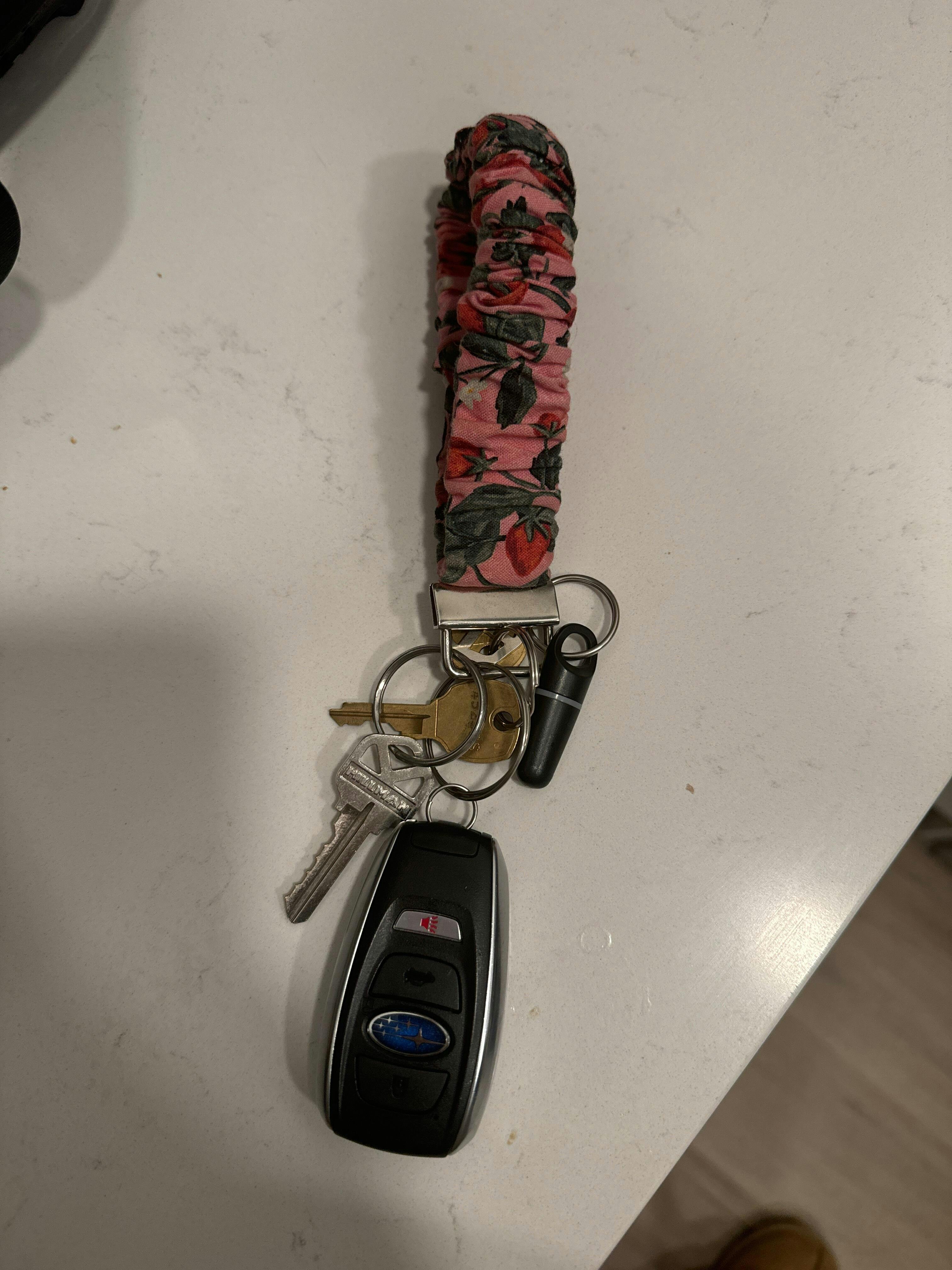 Elevate your key-carrying game with this stylish and practical wristlet keychain, designed to keep your keys handy and accessible at all times. Made with cotton fabric and a stretchy elastic band, this scrunchie style keychain allows you to wear it comfortably around your wrist or higher up on your arm for a trendy touch.